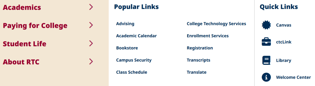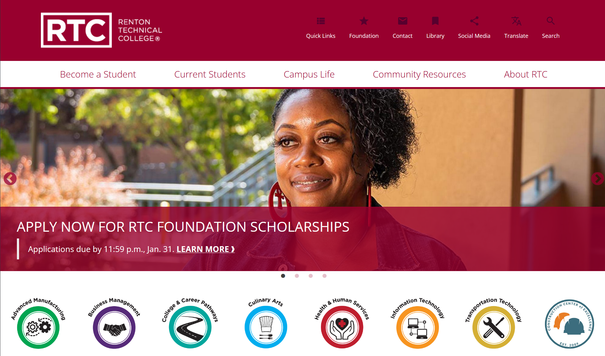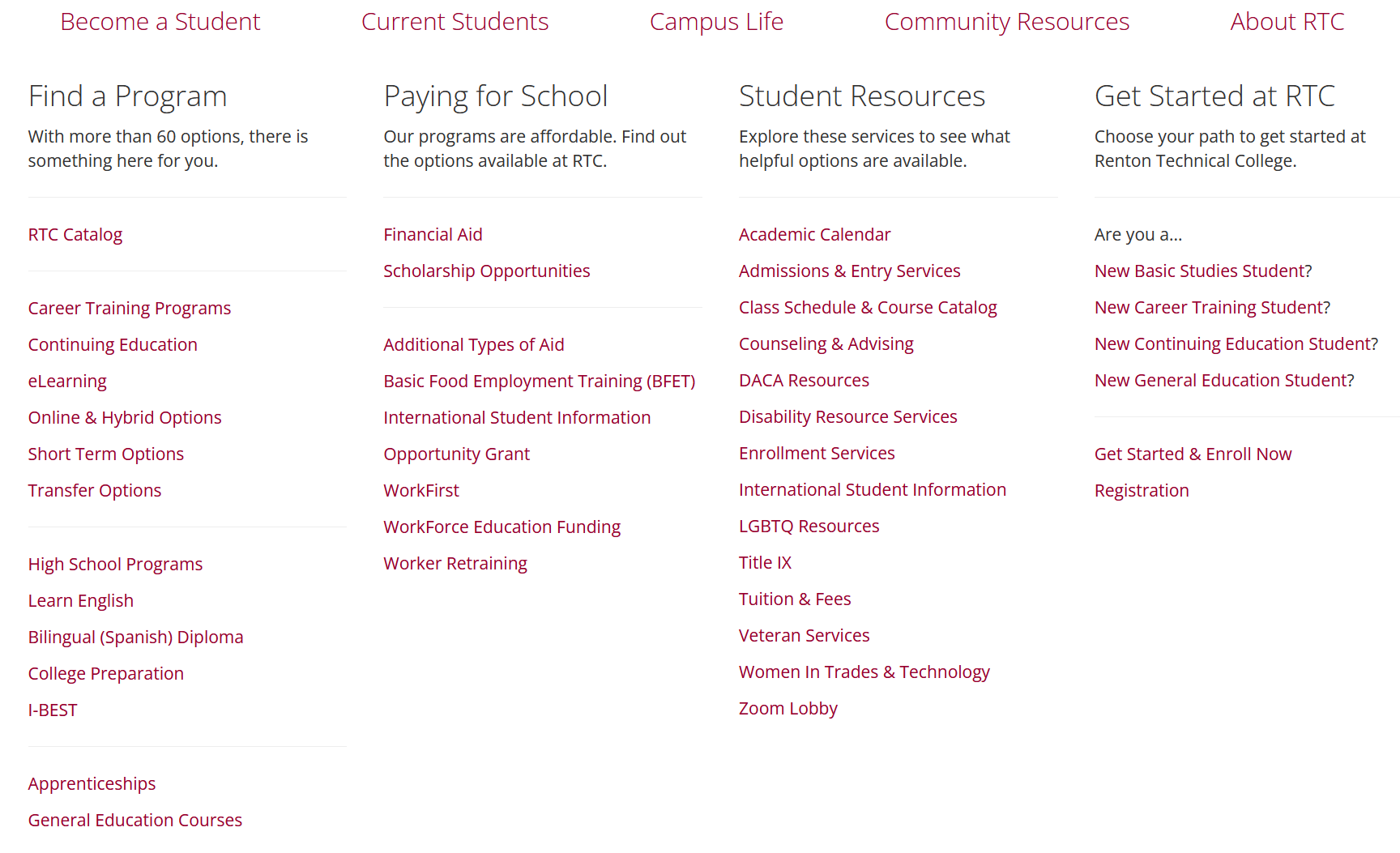 At RTC, we decided to update our website after more than eight years with our old design. A lot changes in nearly a decade. Our old site was showing its age; the design was dated and our menu contained nearly 200 items between six different drop-down menus. In updating our new site, our goals were simple: 1) create a student-focused design; and 2) improve the user experience.